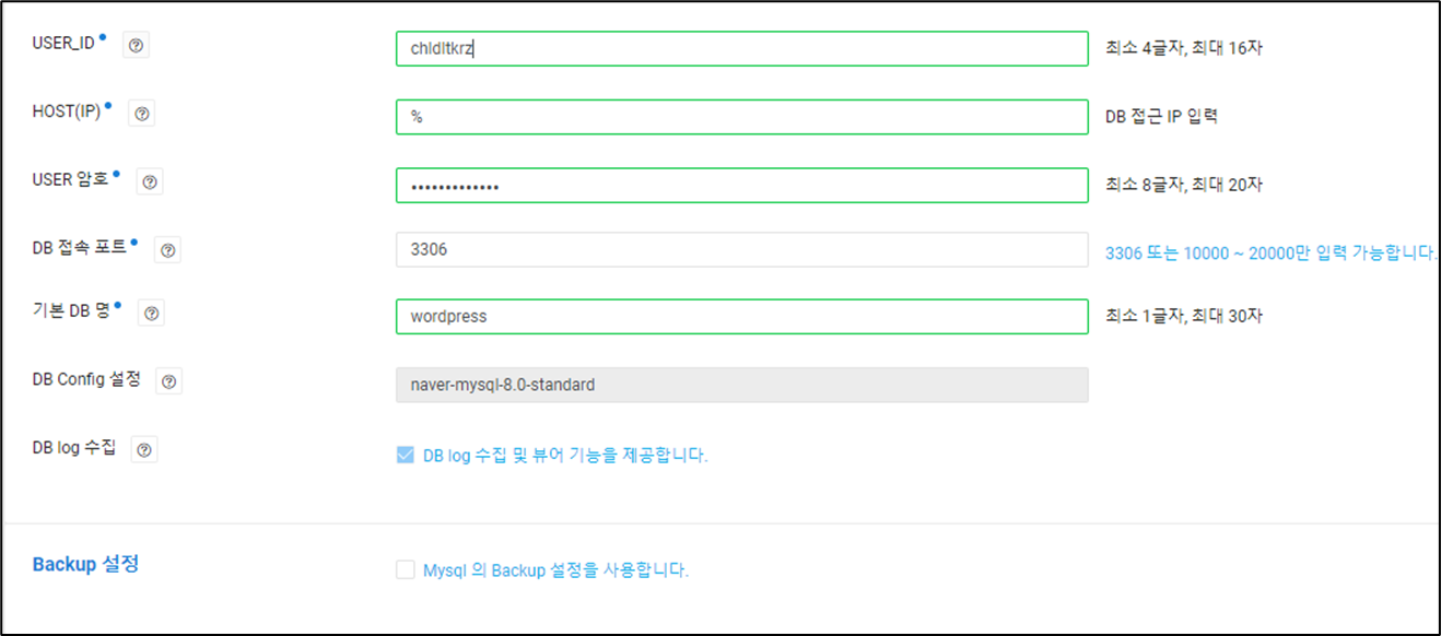 - HOST(IP)는 DB에 접속허용할 IP를 정하는 옵션입니다. 여기서는 모든 IP를 허용하기 위해 '%' 를 입력하였습니다