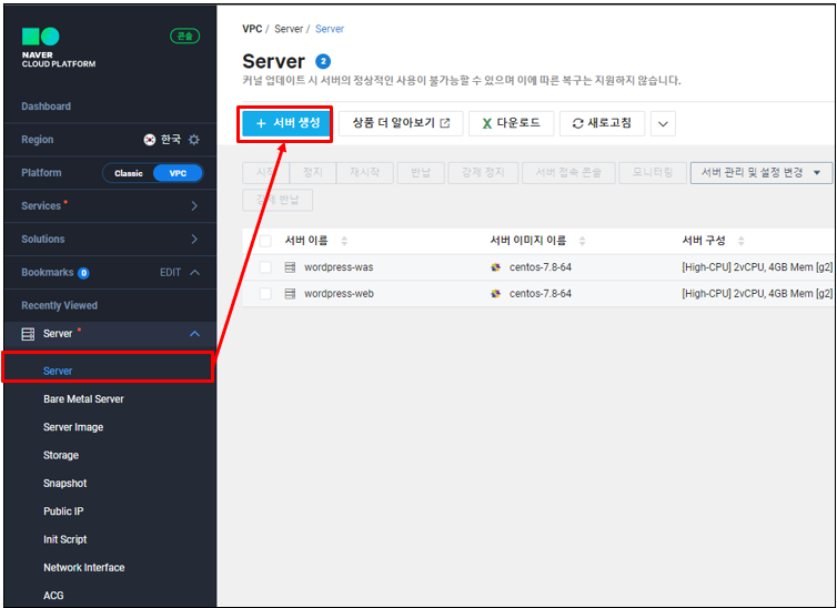 서버는 총 2대(Web, WAS)를 생성할 시간입니다.