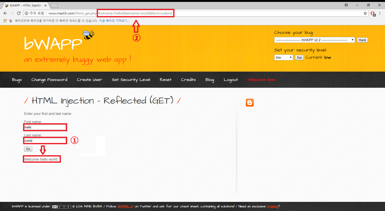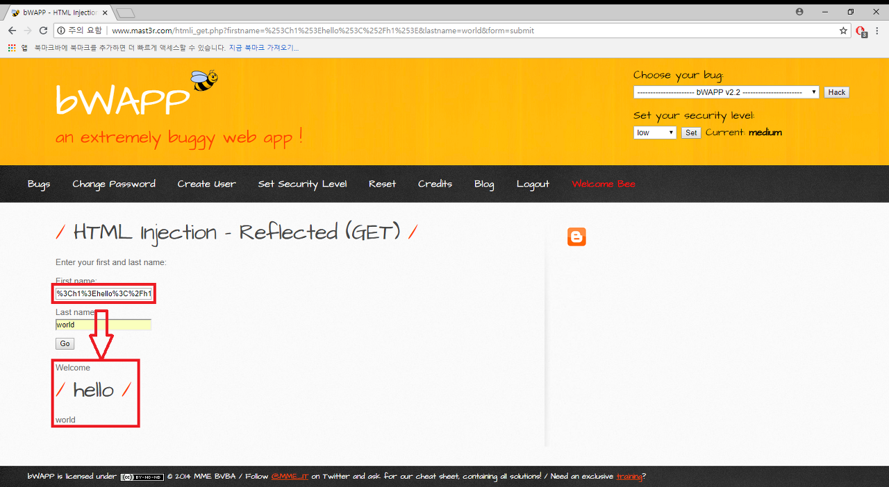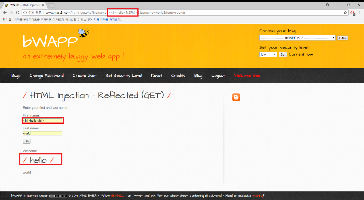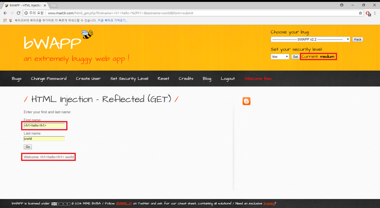 이번에 풀어볼 문제는 bWAPP의 A1-Injection Section의 제일 첫번째 문제인 HTML Injection -REflected(GET) 문제입니다!!