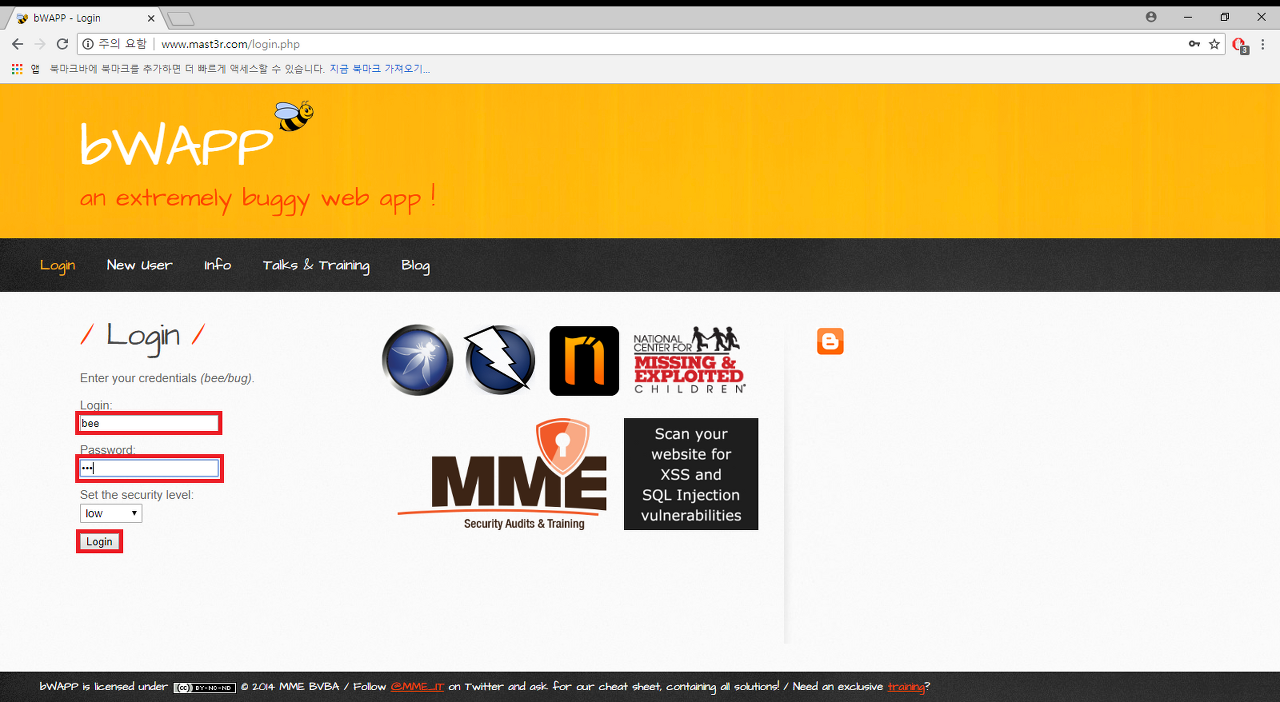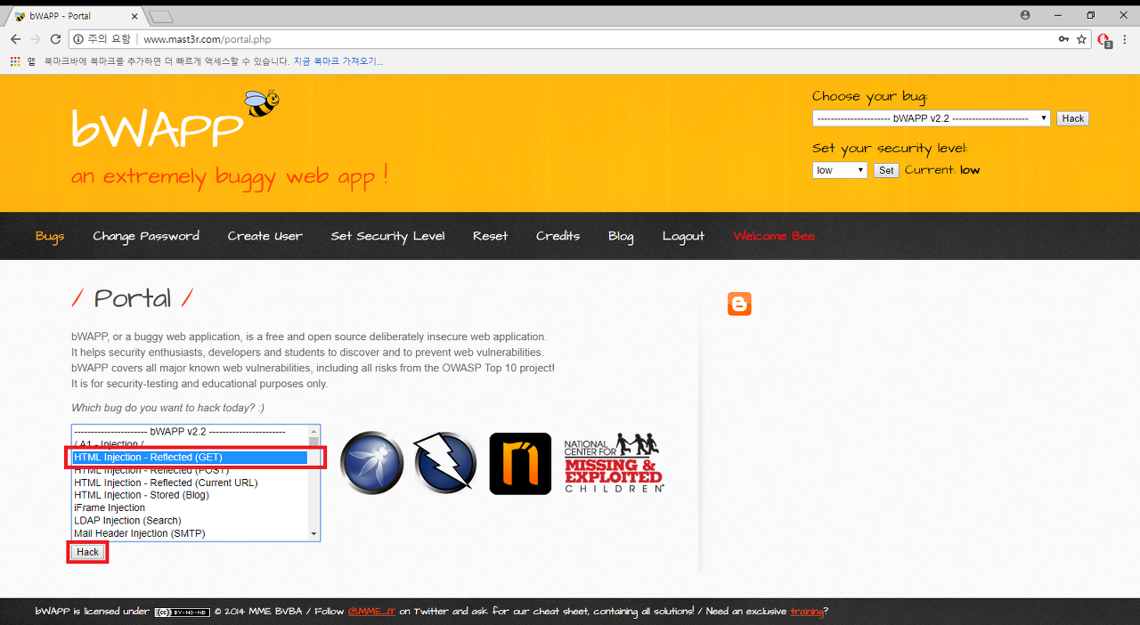 문제풀이를 위해 기본페이지에서 위 사진과 같이 로그인을 한다. (ID:bee PW:bug) 밑에 보이는 난이도는 기본으로 low로 설정되어 있으니 바꾸지 말고 로그인한다.