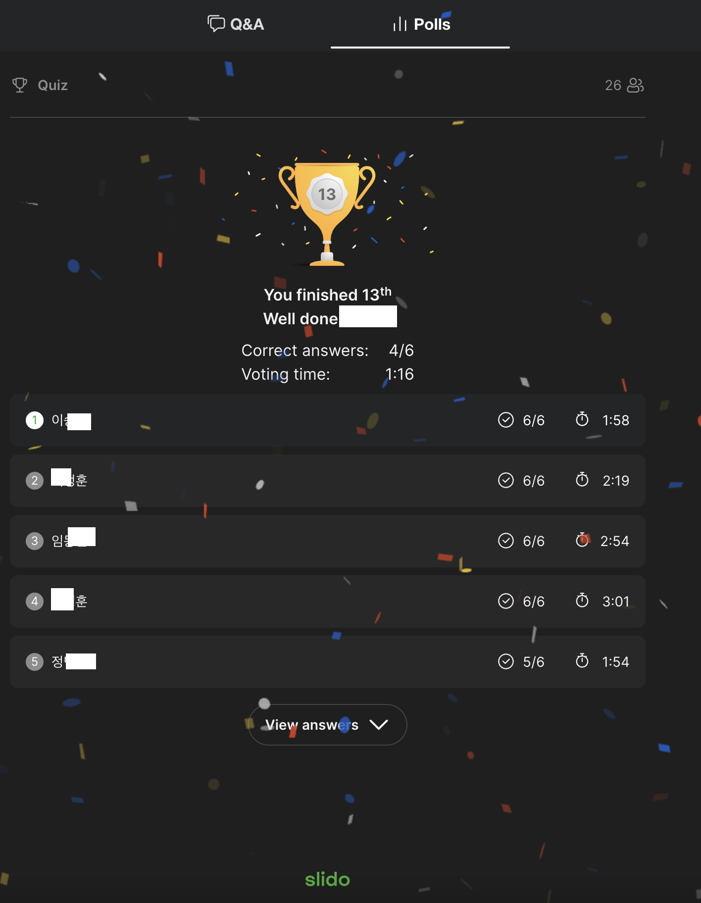이게 매우 재밌는게 맞은 개수와 정답을 체크한 시간으로 수강생들의 순서가 나오더라구요!ㅋㅋ