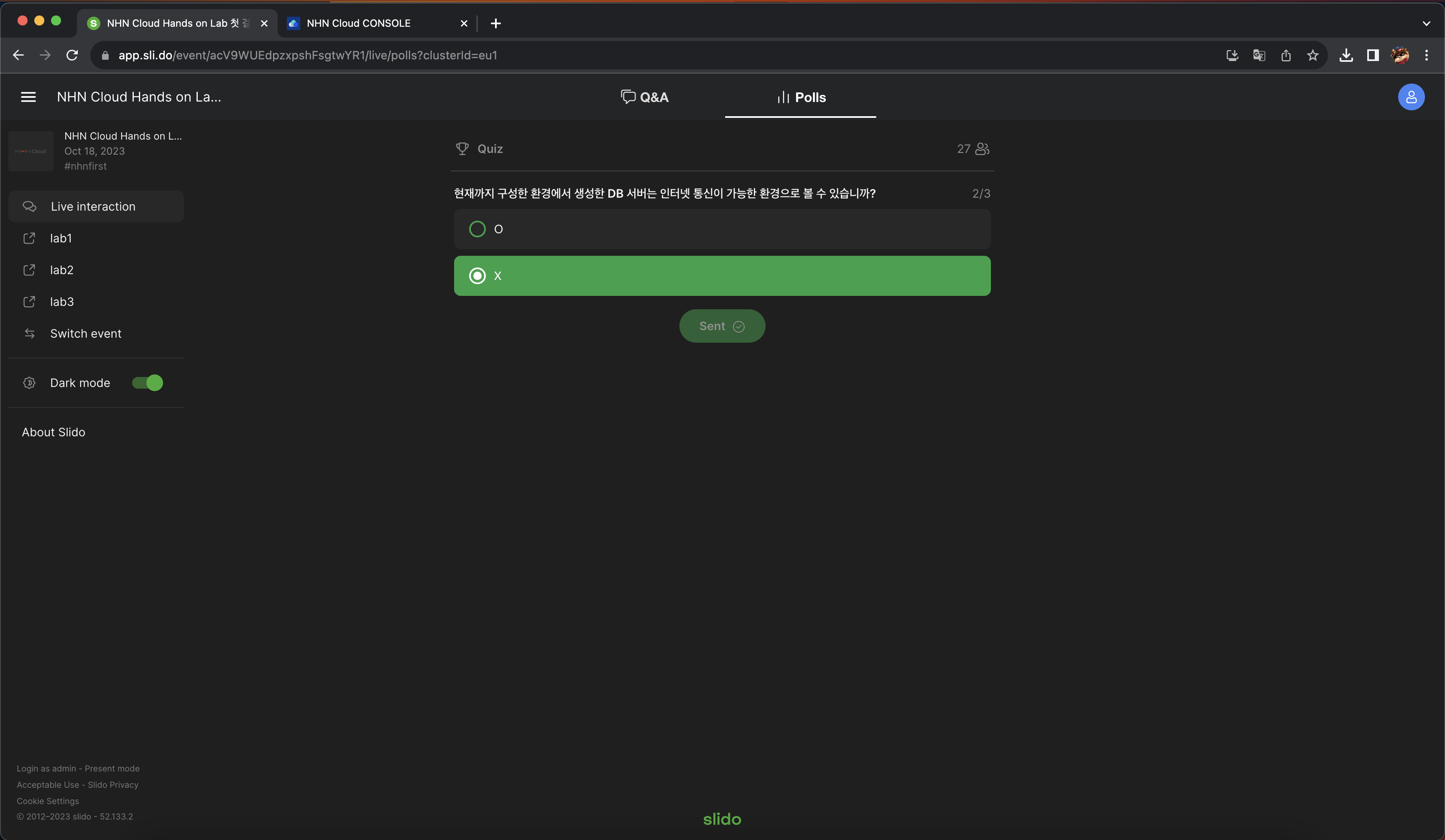각 Lab이 진행될때 아래 사진과 같이 Lab을 완료하였는지 Slido 플랫폼을 이용해서 체크하고